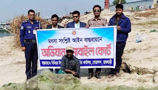 জানা যায়, গোয়ালন্দ উপজেলা সিনিয়র মৎস্য কর্মকর্তা মো. আনোয়ারুল ইসলাম এবং দৌলতদিয়া নৌ পুলিশ ফাঁড়ির ইনচার্জ ত্রিনাথ সাহা দ্বয়ের নেতৃত্বে সোমবার দুপুর আড়াইটার দিকে গোয়ালন্দ উপজেলাধীন কলাবাগান নামক স্থানে পদ্মা নদীতে পরিত্যক্ত অবস্থায় এক লক্ষ মিটার কারেন্ট জাল উদ্ধার এবং ৩০০ মিটার কারেন্ট জাল সহ ০১ জন জেলেকে আটক করা হয়। এসময় পরিত্যক্ত অবস্থায় ০৫ কেজি ইলিশ মাছ উদ্ধার করা হয়। পরবর্তীতে নিকটস্থ মাদ্রাসায় ওই মাছ বিতরন করা হয় এবং পরিত্যক্ত একলক্ষ মিটার কারেন্ট জাল আগুনে পুড়িয়ে ধ্বংস করা হয়।