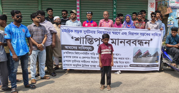 মানববন্ধনে বাস ডুবিতে নিহত জোস্না বেগমের শিশু সন্তান আলিফ, জোস্নার মা শাহিদা বেহম, পৌর বিএনপি নেতা এম এ খালেদ পাভেল, শিক্ষার্থী তানভির মাহাদি রলিফ, মাহিন শিকদার তামিম, হাসিবুল ইসলাম শিমুল বক্তব্য রাখেন। এ সময় নিহত জোস্না বেগমের বড় ছেলে জিসান সহ শিক্ষার্থীরা উপস্থিত ছিলেন। মানববন্ধন শেষে শিক্ষার্থীরা জেলা বাস মালিক সমিতির কার্যালয়ে যান তাদের দাবি সমুহ উপস্থাপনের জন্য।